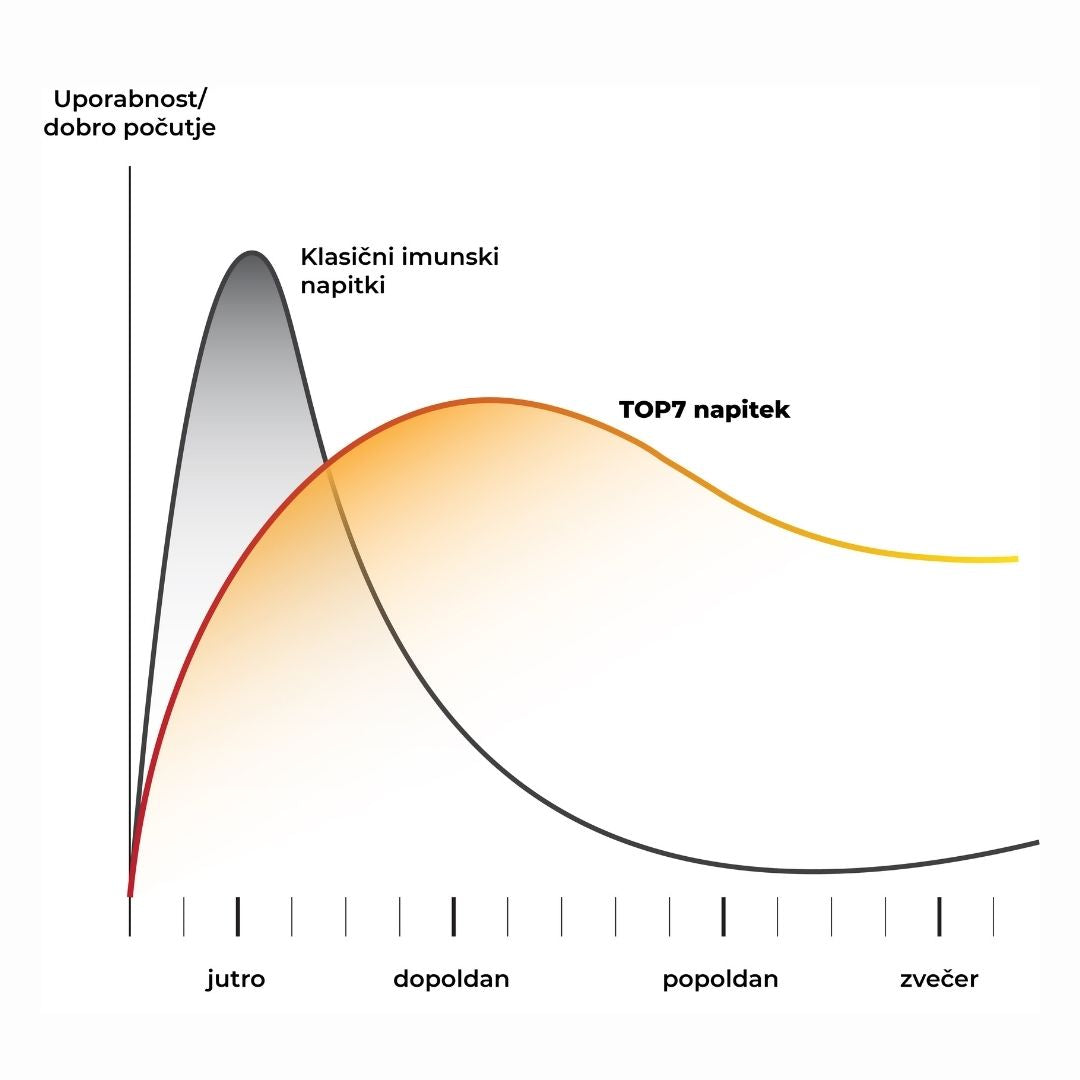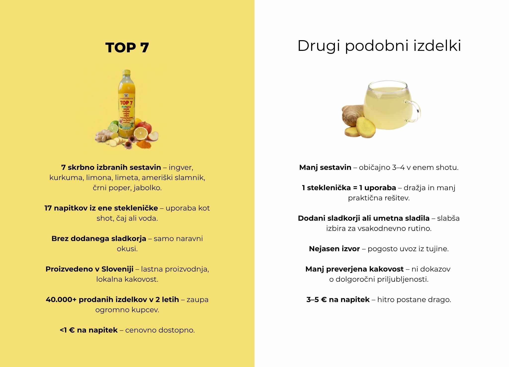 TOP7 lahko uporabiš kot jutranji shot, topel čaj ali osvežilno vodo – vedno z naravno svežino in podporo tvojega telesa. Ena steklenička = 17 napitkov za cel dan, brez dodanega sladkorja.